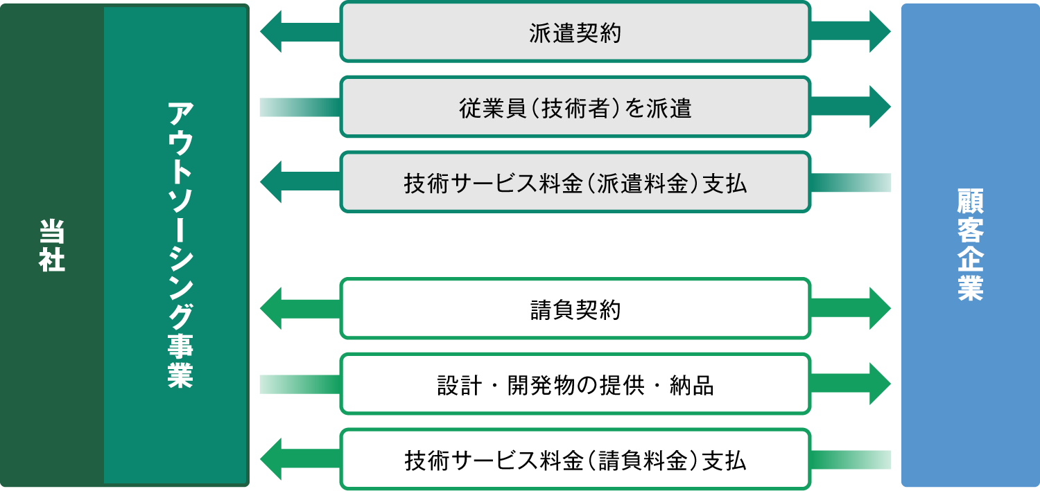 当社は経営理念「開発・設計のプロ集団として業界の長期安定と社員の永続的成長を計り技術を通じ社会に貢献する。」のもと、大手メーカーを中心とした各顧客企業に対して、その開発パートナーとして技術、設計、開発等での機械設計、電子設計、ソフト開発の技術サービスを提供するアウトソーシング事業を展開しております。お客様先の指揮命令下で業務を行う技術者派遣と、設計・開発等の委託された業務を行う業務請負があります。当社は高い技術力でお客様のニーズにお応えします。